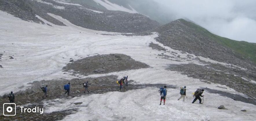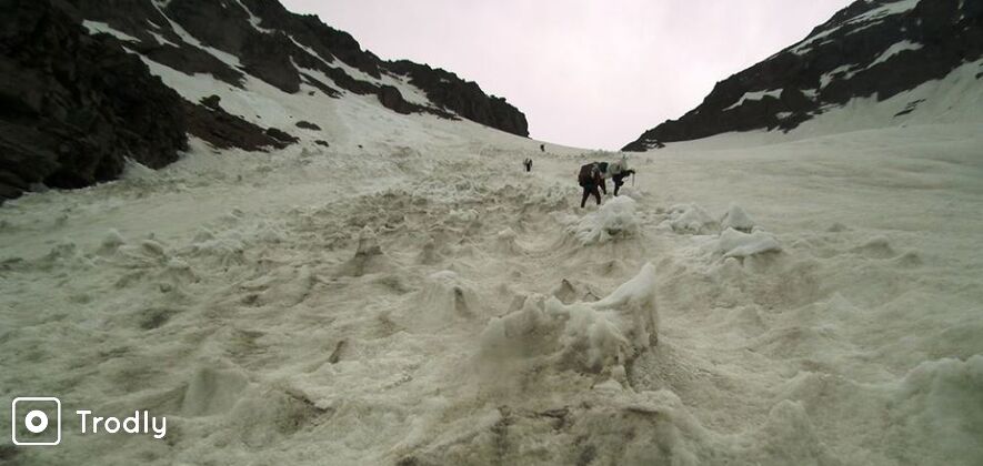 The day will be a long, arduous day with a steep climb to the pass crossing a stretch of scree, a moraine and the Kalihani glacier. Take time off at the pass to get a splendid 360 degree view of hanging glaciers, the Pir Panjal and Dhauladhar ranges. A steep descent across another glacier and four beautiful glacial lakes will bring you to the camp at the gaddi campsite of Devi ki Marhi.